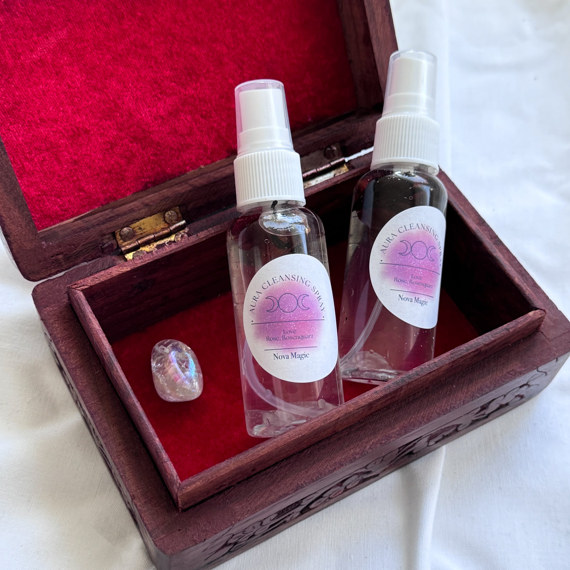 Unser Aura Spray ist eine einzigartige Mischung aus reinen ätherischen Ölen, natürlichen Bergkristallen Kristall und energetisierten Mondwasser, die darauf abzielen, deine Aura zu klären, zu stärken und zu harmonisieren.