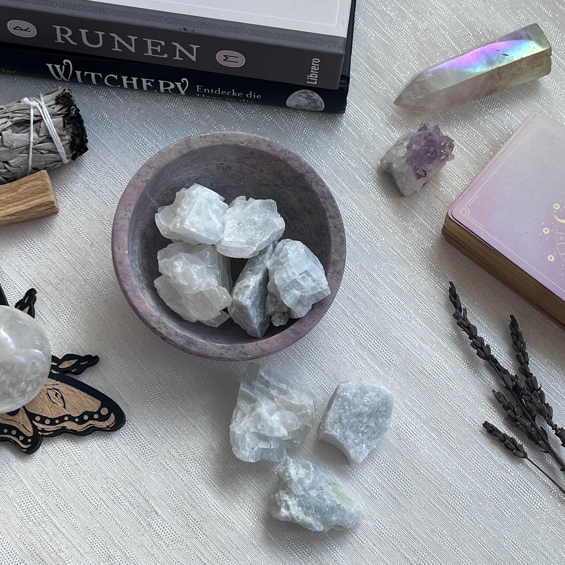 Der Blaue Calcit eignet sich zu dem auch, um dein Trinkwasser energetisch aufzuladen. Achte dabei umbedingt darauf, dass du den Stein vor dem trinken aus dem Gefäss nimmst und nicht verschluckst! Niemals in den Mund nehmen, sicher vor Kindern und Haustieren aufbewahren - Erstickungsgefahr!