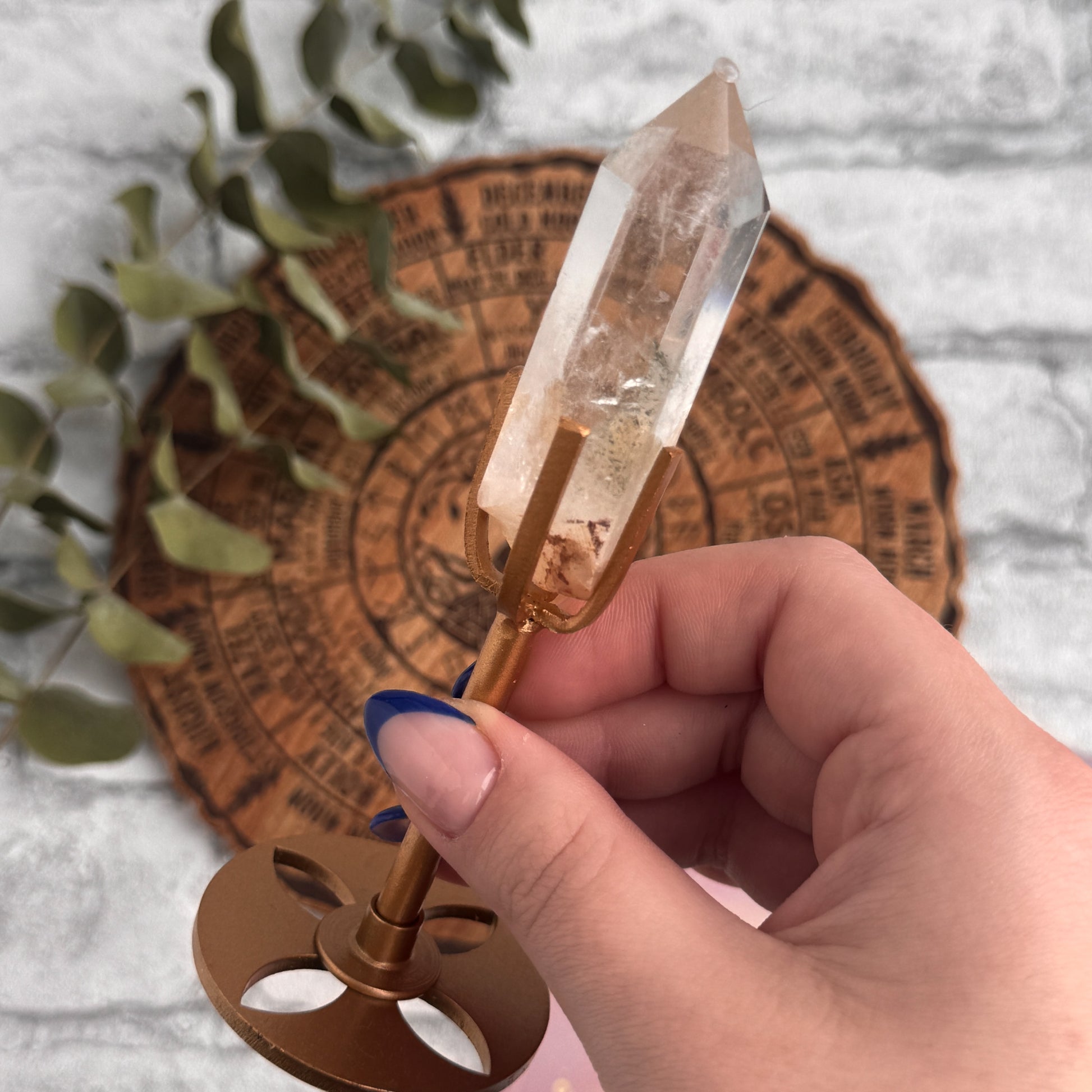 Zum Teil geschliffene, zum Teil naturbelassene Bergkristall Spitze in höchster Qualität auf goldfarbenem Metalständer